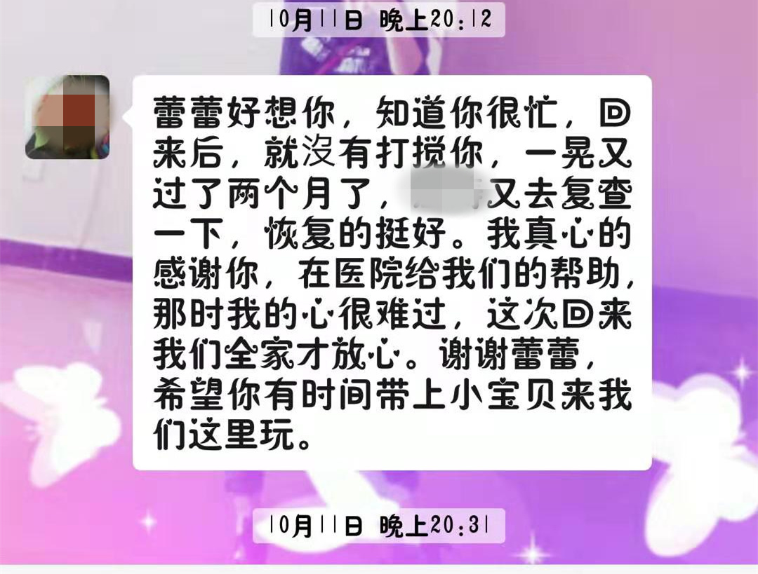 “蕾蕾,好想你!知道你很忙,出院后就没有再打扰你,今天小王复查的结果显示恢复良好,谢谢你在医院对他的照顾……”