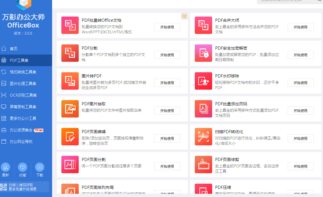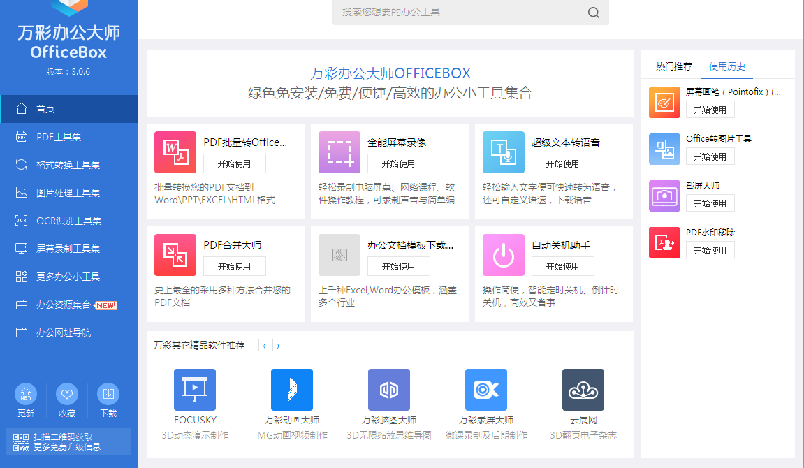 这款软件分为标准安装版、绿色安装版和全套离线包安装版三种安装方式,包括PDF工具、万能格式转换、识别工具、图片处理等60多个小工具。