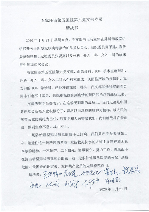 这是我院第六党支部和第一党支部面对“新型冠状病毒肺炎疫情”,所发出的请战书和倡议书中的部分内容,在这样的请战书和倡议书上,医护人员纷纷签字报名。