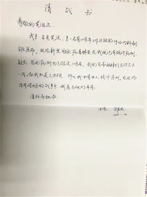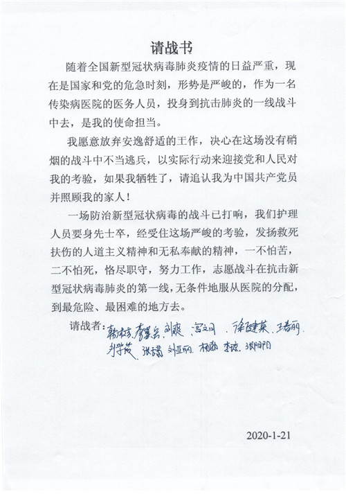 “一场防治新型冠状病毒的战斗已打响,我们共产党员要身先士卒,经受住这一场严峻的考验,发扬救死扶伤的人道主义和无私奉献的精神,一不怕苦,二不怕死,恪尽职守,努力工作,志愿战斗在抗击新型冠状病毒的第一线,无条件地服从医院的分配,到最危险、最困难的地方去,发挥共产党员的先锋模范作用。”