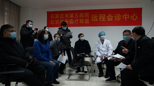 专家们在远程会诊中心详细询问了我院留观、确诊、疑似病人救治情况,以及疫情开始到现在的接诊、预检分诊、就诊流程、医护人员防护等情况。并通过视频与一位确诊患者连线交流,详细询问了患者的诊治进展,鼓励她要坚定战胜病魔的信心和勇气,保持乐观的心态,积极配合治疗,争取早日康复。