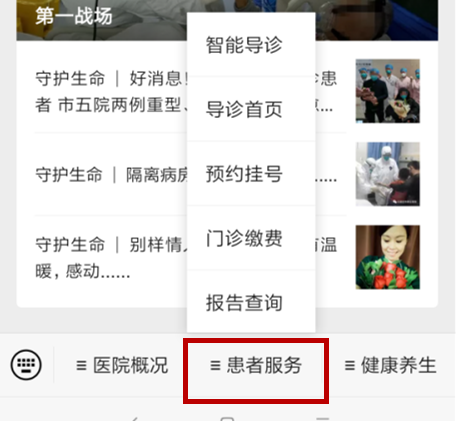 首先关注“石家庄市第五医院微信服务号”,在下方菜单中点击“患者服务”,选择“智能导诊”。根据当下疫情,智能导诊小程序会询问您是否需要进行新型冠状病毒肺炎筛查,点击“是”就会进入新冠肺炎智能筛查界面;点击“否”则会进入普通病智能导诊平台。