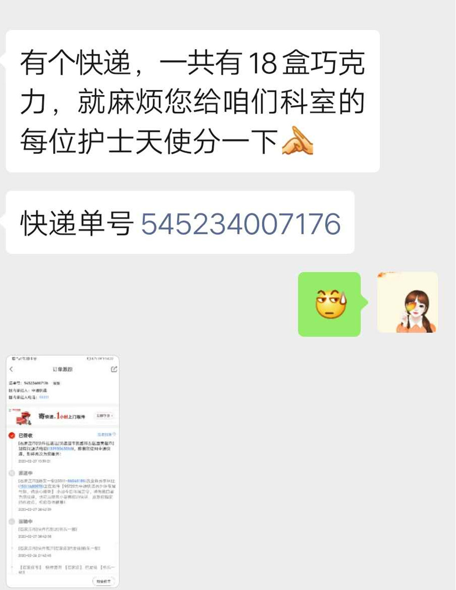 “有个快递,共有18盒巧克力,麻烦您给咱们科室的每位护士天使分一下。”这是一位治愈出院的新冠肺炎确诊患者发来的消息,这更是一条爱的传递信息。