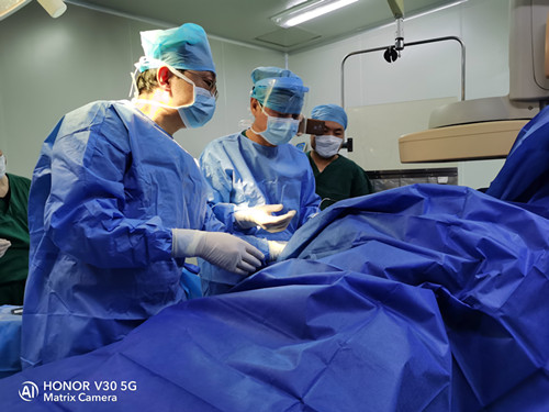 该患者49岁,4个月前患子宫内膜癌并广泛转移,腹部疼痛剧烈,口服镇痛药物、贴敷止痛贴,仍不能控制疼痛,睡眠及饮食质量较差,且无法耐受止痛药物带来的副作用。患者备受折磨,迫切希望早日解除痛苦。经过与患者、家属积极沟通,为提高患者生活质量,市五院麻醉医护团队决定为其进行微创疼痛治疗——体内植入术,通过给予药物,缓解患者疼痛。手术当天,经过充分准备和精准定位,在局麻情况下,麻醉医生仅用40分钟时间就为患者进行了皮下植入注射装置安装,顺利完成手术治疗。术后第二天,患者疼痛感明显减轻,被病魔折磨已久的她,终于露出了笑容。